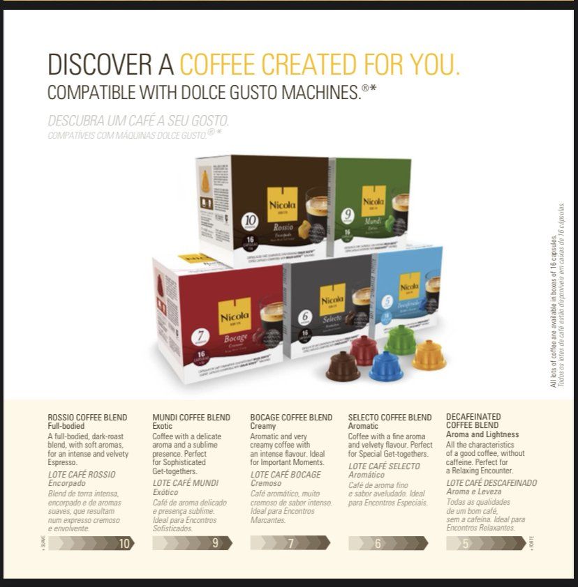 Nicola has developed a new line of coffee capsules with you in mind. Take a break and enjoy the pleasure of a good Portuguese coffee. Nicola's newest product is available in capsules for the Rossio, Mundi, Bocage, Selecto and decaffeinated blends. Compatible with Nespresso machines.